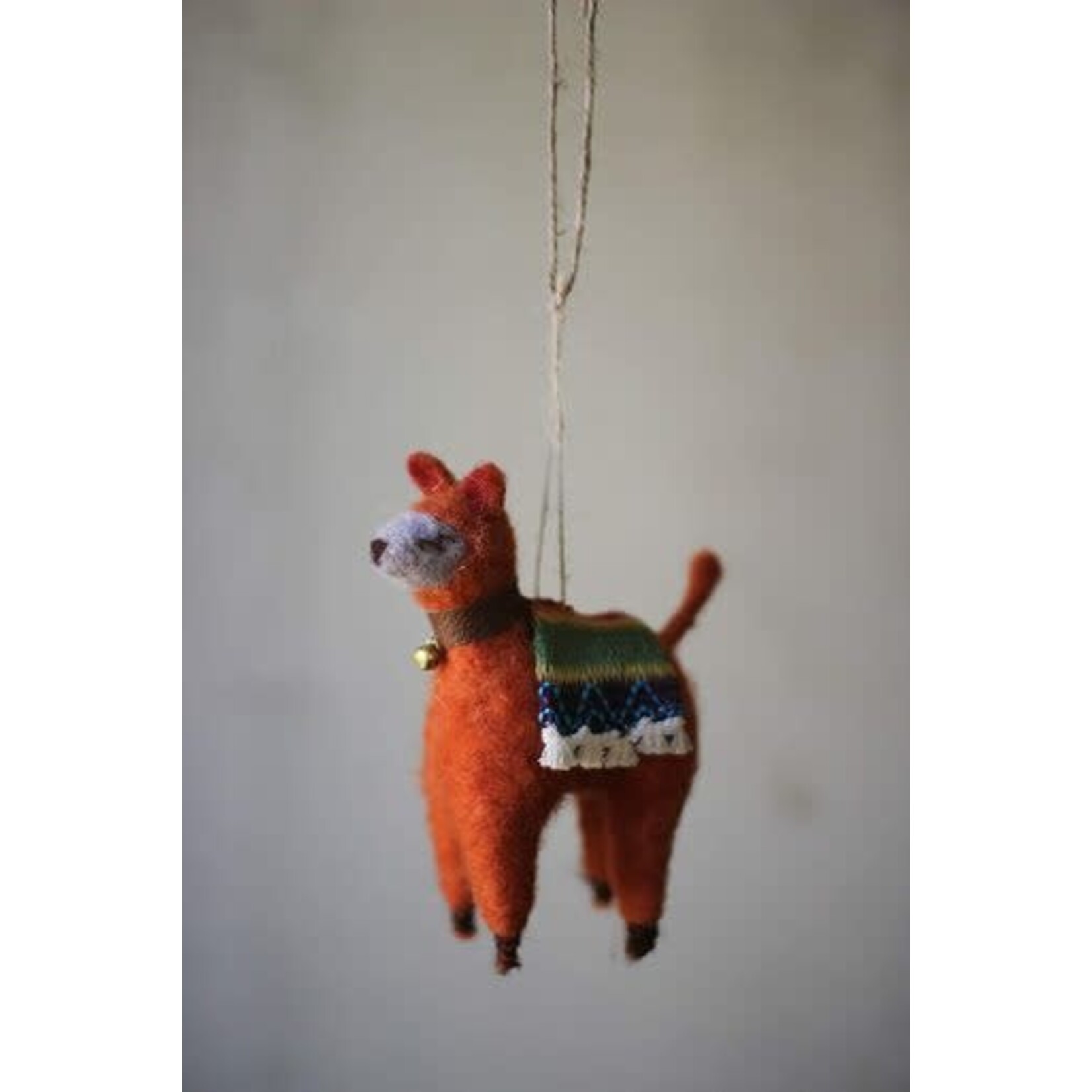 Is it an alpaca or a llama? Either way it’s a cute-as-can be felt camelid that you need for your Christmas tree. Chestnut with beautiful woven blanket and brown collar with a tiny brass bell. Handmade. 4"x 2"x 6"