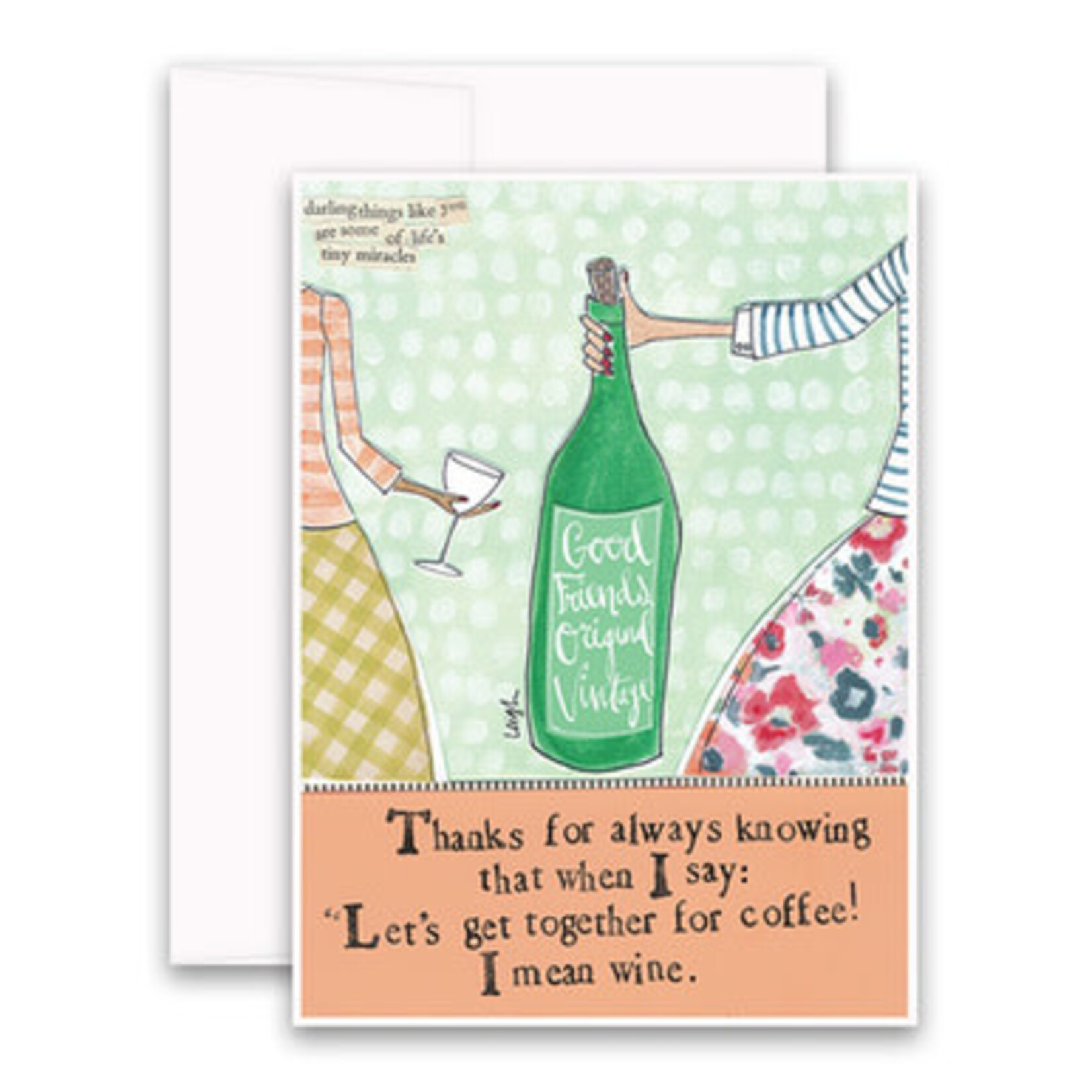 Thanks for always knowing that when I say let's get together for coffee! I mean wine. Small words: darling things like you are some of life's tiny miracles Embrace the magic of small moments with Curly Girl! Colorful collage art and hand-stamped wisdom make every piece a work of art that happens to be a super handy, post-perfect greeting card! A6 Card (4-1/2 x 6-1/4) Blank Inside White Envelope Poly-Sleeved